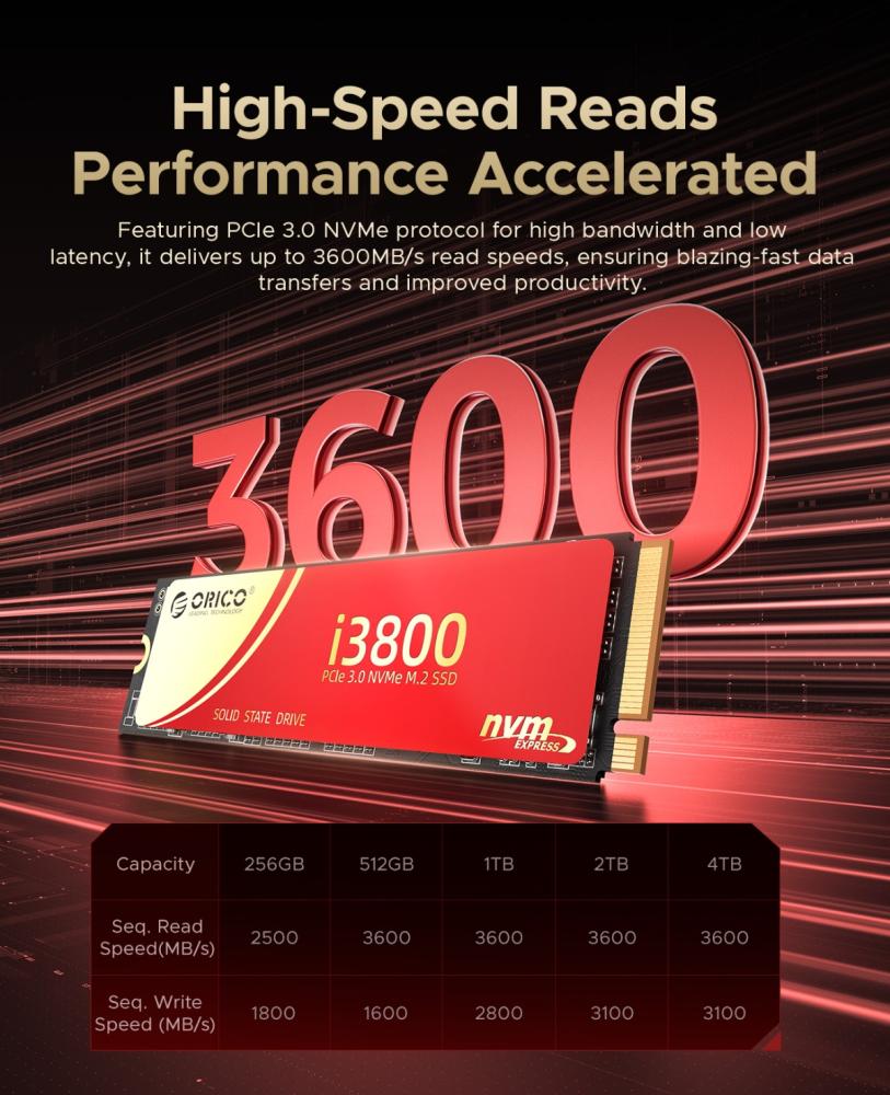 The ORICO i3800 512GB M.2 NVMe 2280 SSD is a high-performance storage device designed for demanding applications. Utilizing the PCIe 3.0 x4 interface, it delivers rapid read speeds of up to 2800MB/s and write speeds of up to 1600MB/s. It features 3D NAND flash memory for enhanced reliability and efficiency. With a capacity of 512GB and a TBW (Total Bytes Written) rating of 150TB, it offers ample storage and durability. ORICO backs this SSD with a 5-year warranty, providing long-term peace of mind.