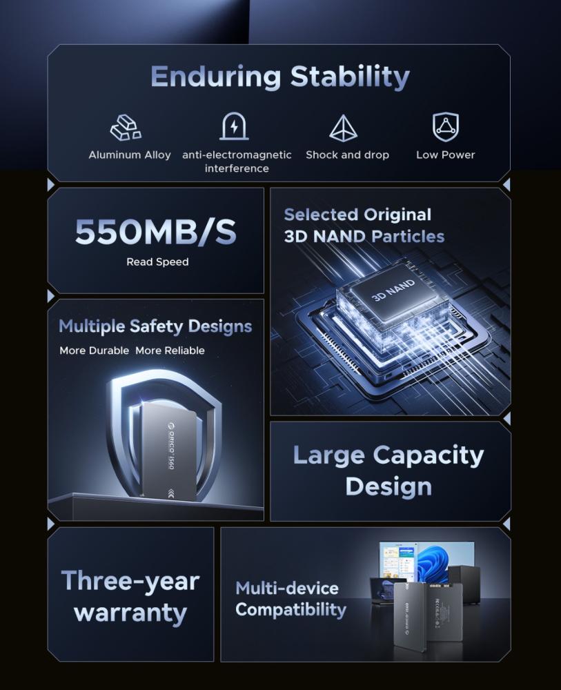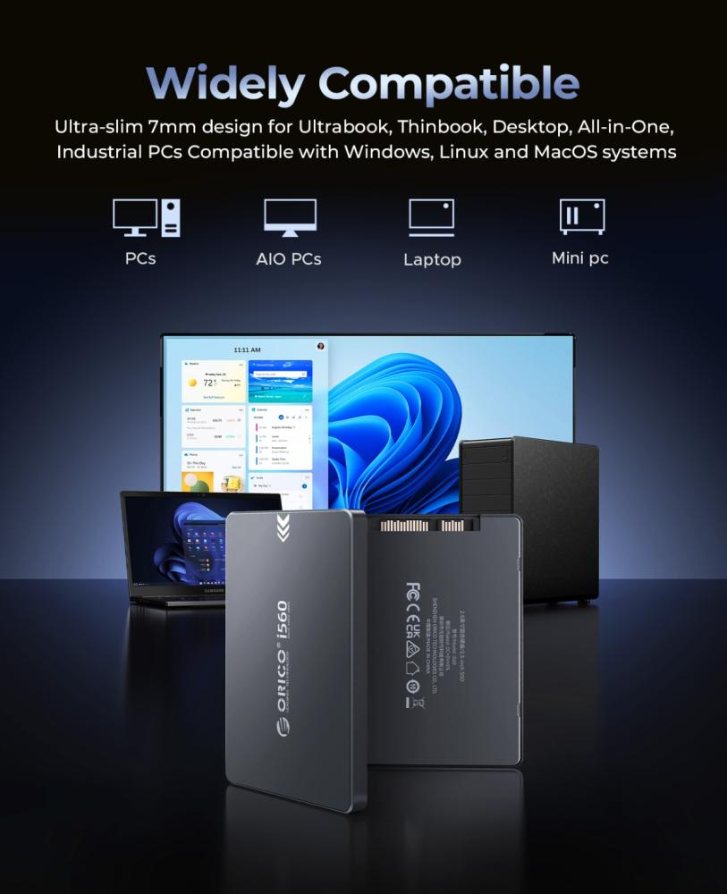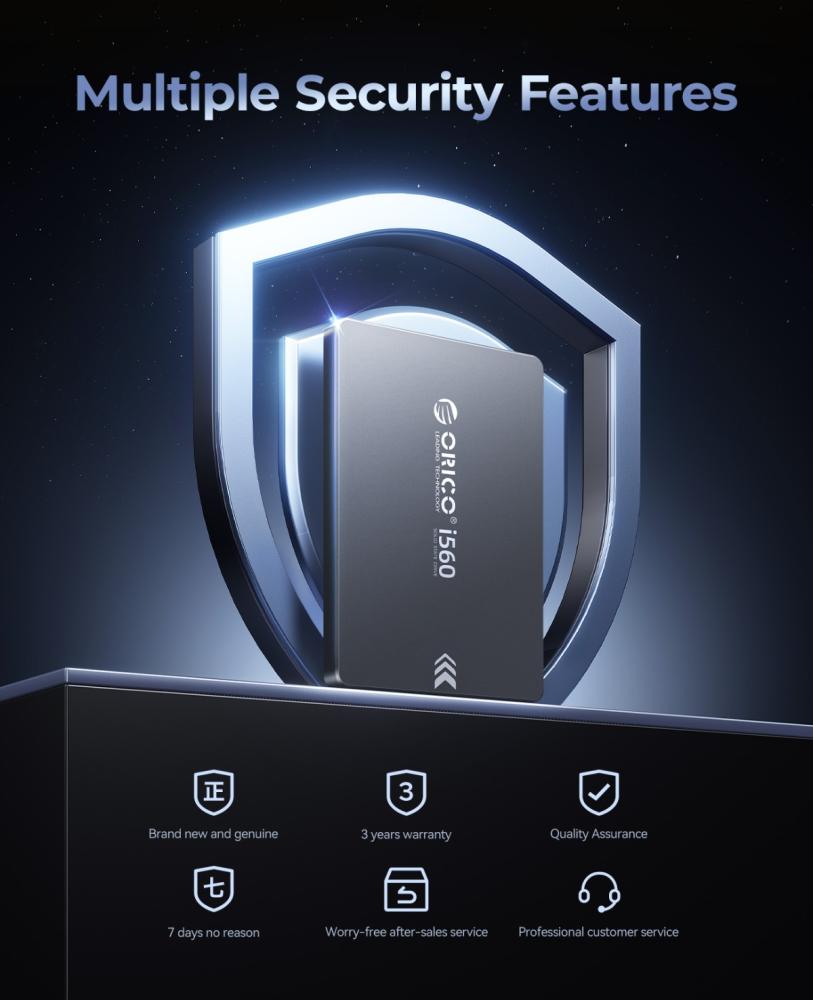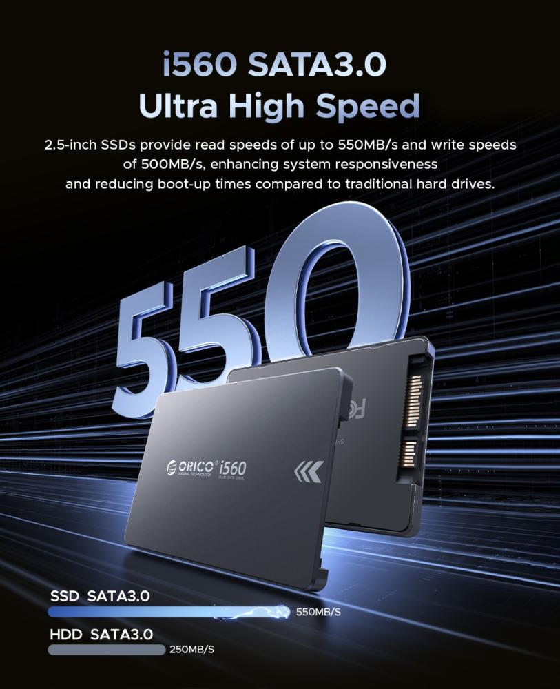 The ORICO i560 128GB 2.5-inch SSD is a compact and reliable storage solution. Encased in a durable aluminum housing, it offers a sleek and robust design. Utilizing the SATA 3.0 interface, it delivers read speeds of up to 450MB/s and write speeds of up to 400MB/s, providing a noticeable performance boost compared to traditional hard drives. With dimensions of 100mm x 70mm x 7mm, it fits seamlessly into standard 2.5-inch drive bays. It has a Total Bytes Written (TBW) rating of 50TBW, indicating its endurance for everyday use. ORICO provides a 3-year warranty for added peace of mind.