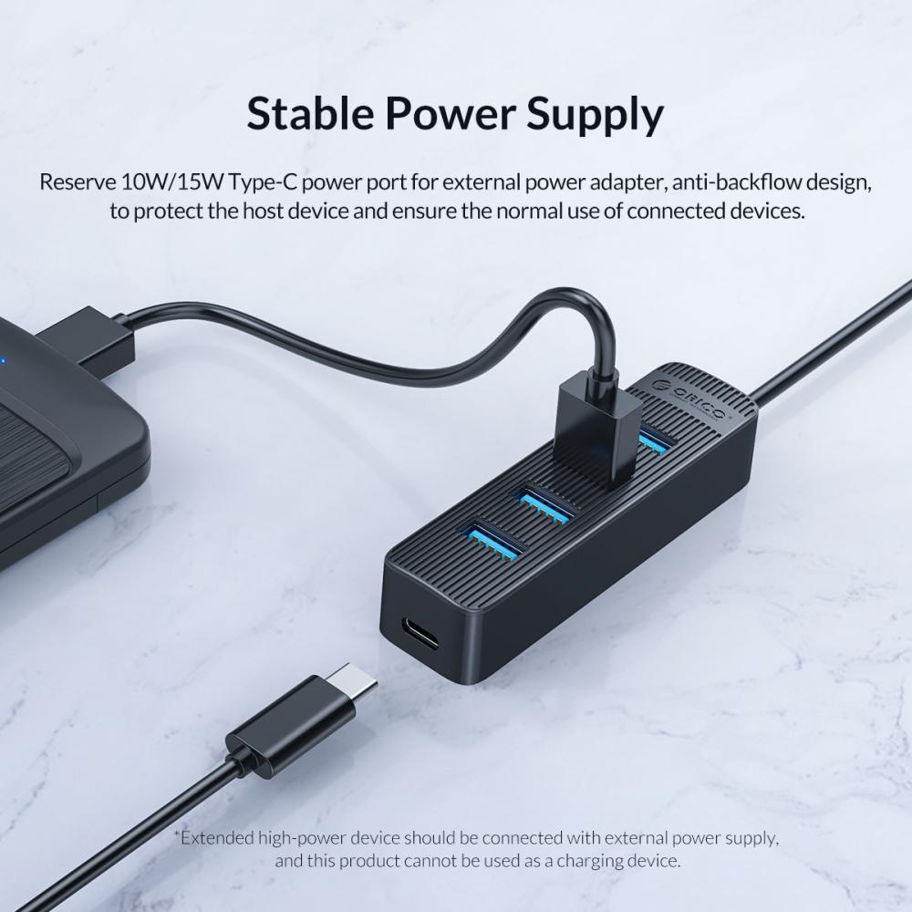 The ORICO-TWU3-4A is a compact and convenient 4-Port USB 3.0 HUB, designed to expand your connectivity options. Constructed from durable ABS material, it's available in both black and white. It features four USB-A 3.0 input ports and one USB-A 3.0 output port, allowing you to connect multiple devices simultaneously. Its compact dimensions of 93mm x 25mm x 19mm make it easily portable. A 5V 2A reserve power port is included for devices requiring additional power. The hub comes with an integrated 15cm data cable for easy connection.